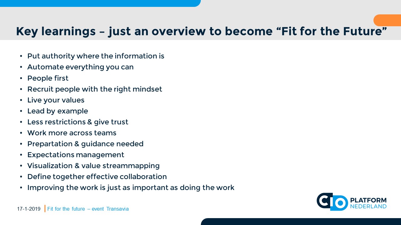 The theme of the session was "Fit for the Future!". All kinds of organizations are in a transition to become a high-performance organization, where speed and flexibility are key. Building blocks to make this possible are an Agile & Lean way of working, a modern software application landscape, accelerating software development, creating an intelligent IT infrastructure and adoption of talent management. In the first contribution, Rik told his experiences at Transavia, how it started, what the first results were, and the importance of paying constant attention to the activities of the teams. This approach fits seamlessly with Transavia's "we make low cost feel good" with low-cost focus and feel good value for both customers and employees.