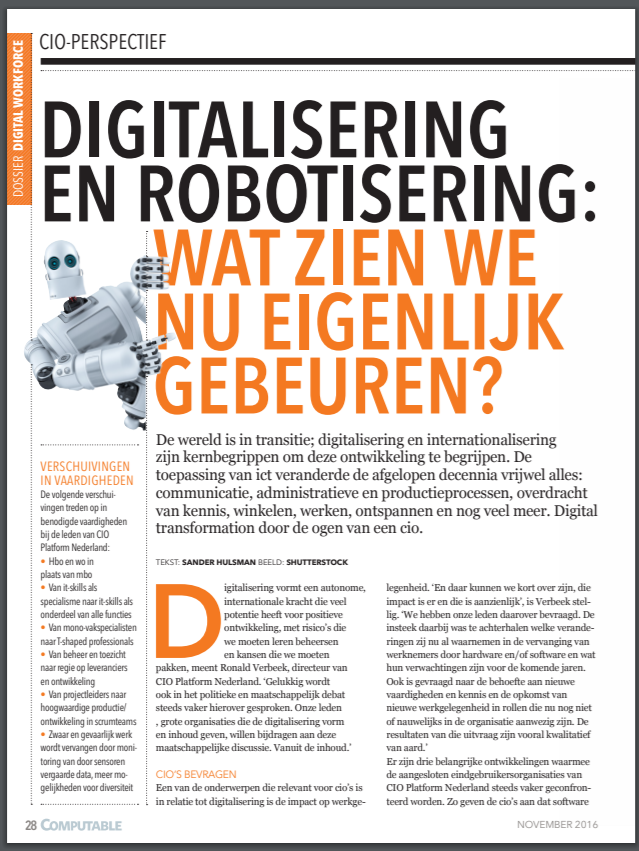 vrijdag 11 november 2016 In de Computable van 4 november 2016 verscheen een artikel van Ronald Verbeek over de impact van digitalisering & robotisering op de werkgelegenheid.
