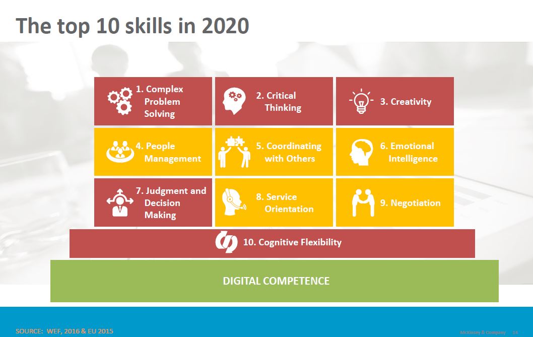 Vanuit de presentatie van Jan Rijken (directeur, Crossknowledge Learning Institute) werden inzichten gepresenteerd vanuit diverse onderzoeken en publicaties over "Are you ready for the digital future". De banen van de nabije toekomst hebben een sterke IT-component. De benodigde skills zijn niet voorhanden. Zo’n 40% van de werkenden in de EU heeft een gebrek aan digitale vaardigheden, 14% heeft zelfs geen enkele ervaring. Voorbeelden van deze digitale skills worden weergegeven in de afbeelding hiernaast.