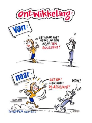 Veel assistants zijn het liefst onzichtbaar. Sara roept op jezelf zichtbaar te maken. En doe dat het liefst morgen al. Het is een talent om als ‘stille kracht’ je werk te doen, maar schiet je daar in door: dan word je onzichtbaar. Realiseer je dat jij de verbindende factor bent, het centrale middelpunt van de organisatie. Zichtbaar worden doe je bijvoorbeeld door jezelf te presenteren als trendwatcher. In jouw positie hoor je vaak als eerste tijdens vergaderingen ideeën over de richting van de organisatie. Denk dan actief mee, durf vragen te stellen en durf je mening te geven. Domme vragen bestaan niet. Boost je zelfvertrouwen.